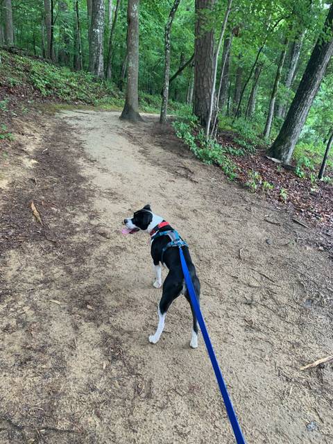 Gus was adopted following three months of foster care. He was adopted by a great, young family with two young children ready for Gus’s playful energy. Because he was raised with young children, he has particularly bonded with the seven-year-old daughter. His adoptive family says, “We were lucky to find Gus through Shooting Star Animal Rescue and we are so happy we found him. Gus has been a great addition to the family. Whether he is cuddling on the couch, hiking the trails at Anne Springs Greenway, or endless hours staring at squirrels, he is always by our side with a big smile on his face.”