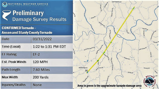 According to the National Weather Service-Raleigh, a band of showers and isolated thunderstorms moved into central North Carolina, one of which produced a tornado that tracked from Burnsville in northwest Anson County to Cottonville in southern Stanly County. The tornado was EF-2 (STRONG) with speeds from 111 to 135 miles per hour. The tornado stayed on the ground most of the time until it lifted in Stanly, causing the worst damage around 1:27 p.m. in Burnsville.